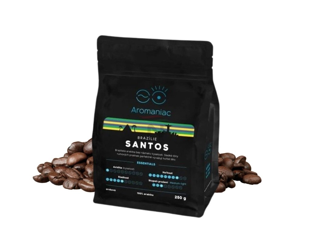 Aromaniac Freshly Roasted Coffee Brazil Santos 250 g is a quality coffee bean from the Santos region of Brazil. It is characterized by a delicate, balanced taste with low acidity and pleasant chocolate and nutty tones, ideal for preparing espresso and other coffee drinks.