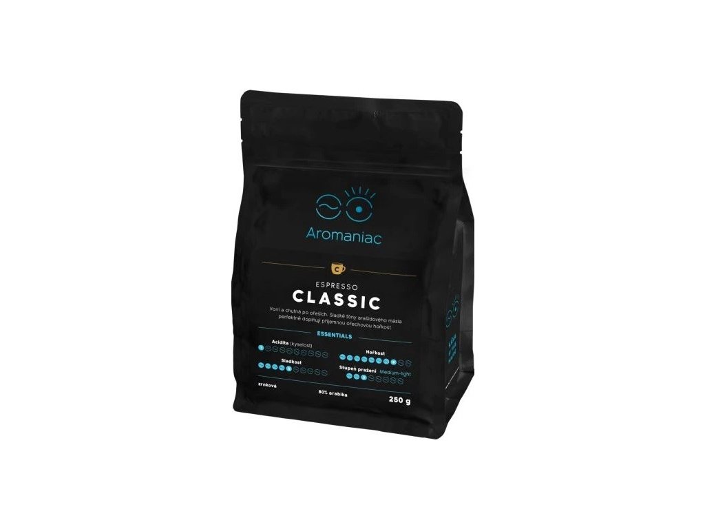 Aromaniac Freshly Roasted Espresso Classic Coffee - Beans 250 g is a balanced blend of 80% Arabica and 20% Robusta, roasted with an emphasis on harmony between delicate acidity and full body. It offers an intense aroma and rich taste with subtle chocolate, nutty and caramel notes, ideal for preparing classic espresso.