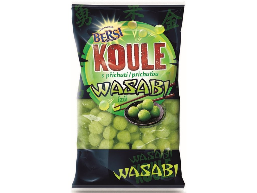 Extruded corn balls with wasabi flavor, hot