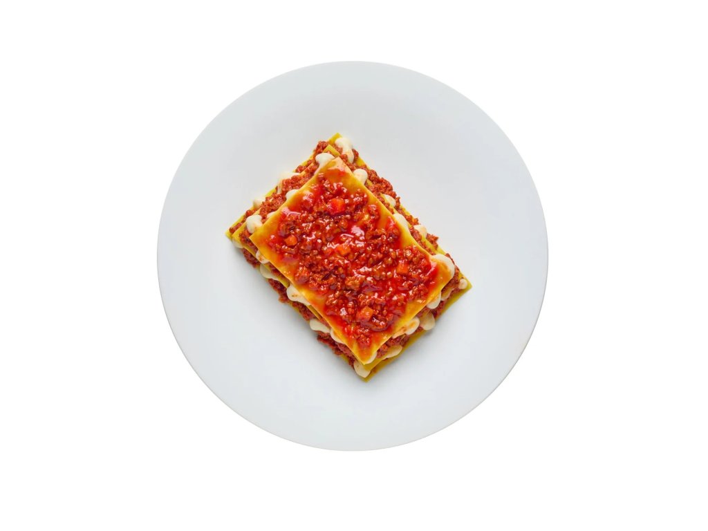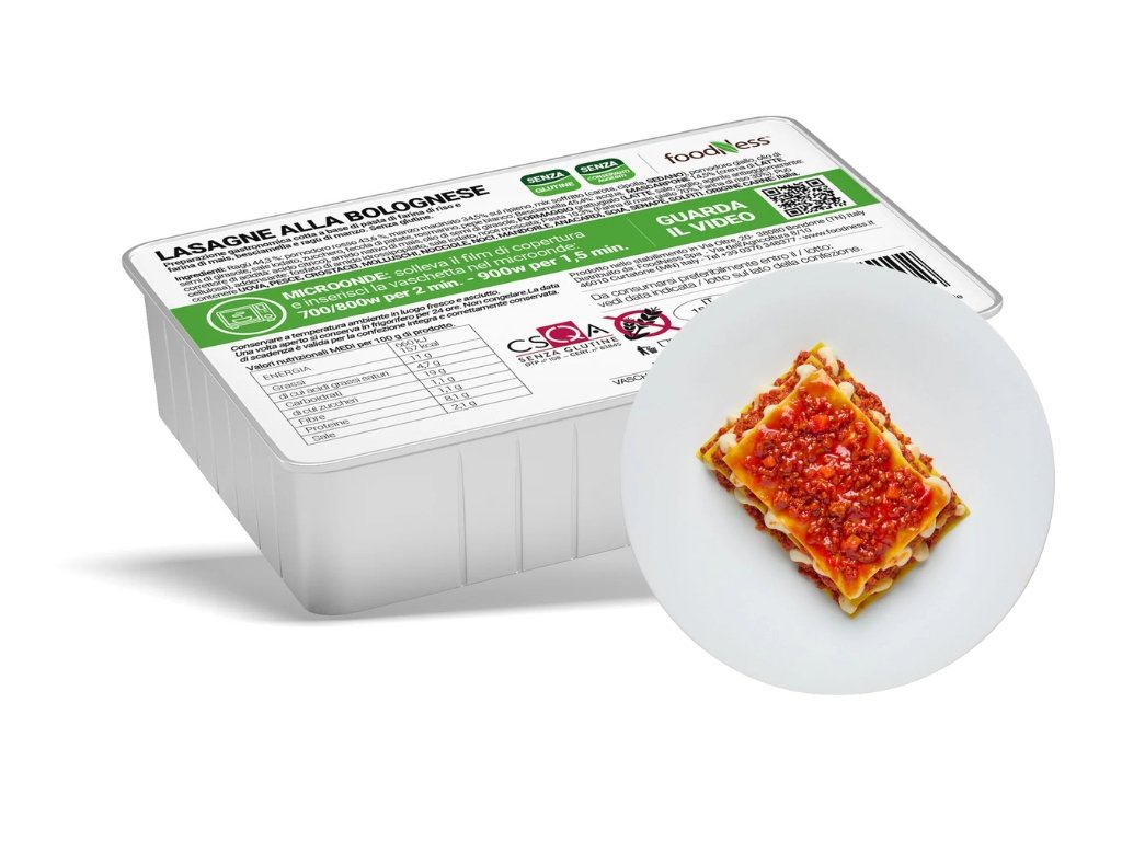 Ingredients: Ragout 44.3%: red tomatoes 43.6%, minced beef 34.5% for the filling, sauté mix (carrots, onions, CELERY ), yellow tomatoes, sunflower oil, iodized salt, sugar, potato starch, rosemary, white pepper; Béchamel sauce 45.4%: water, MASCARPONE 14. 5% ( MILK cream, acidity regulator: citric acid), native corn starch, sunflower oil, grated CHEESE ( MILK , salt, rennet, anti-caking agent: cellulose), thickener: hydroxypropyl starch phosphate, iodized salt, nutmeg; Pasta 10.3% (yellow corn flour 70%, rice flour 30%).
