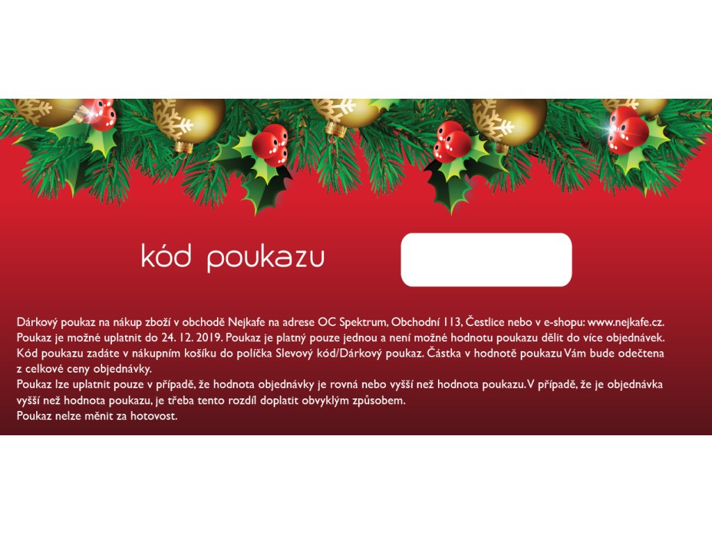A gift voucher for the purchase of goods in the Nejkafe store at the address V Oblouku 599, Průhonice or in the e-shop: www.nejkafe.cz . The voucher can be redeemed until 31 December 2024. The voucher is valid only once and it is not possible to divide the value of the voucher into multiple orders.