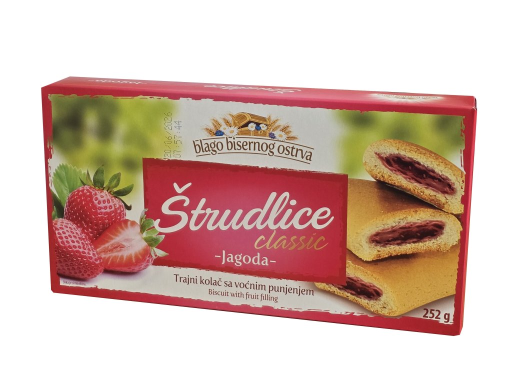 Enjoy a piece of sweet tradition with delicious strawberry strudels from Blago Bisernog Ostrva. This long-lasting pastry is made according to a proven recipe and brings the perfect harmony of soft, supple dough and rich fruit filling, which makes up a full 30% of the product.